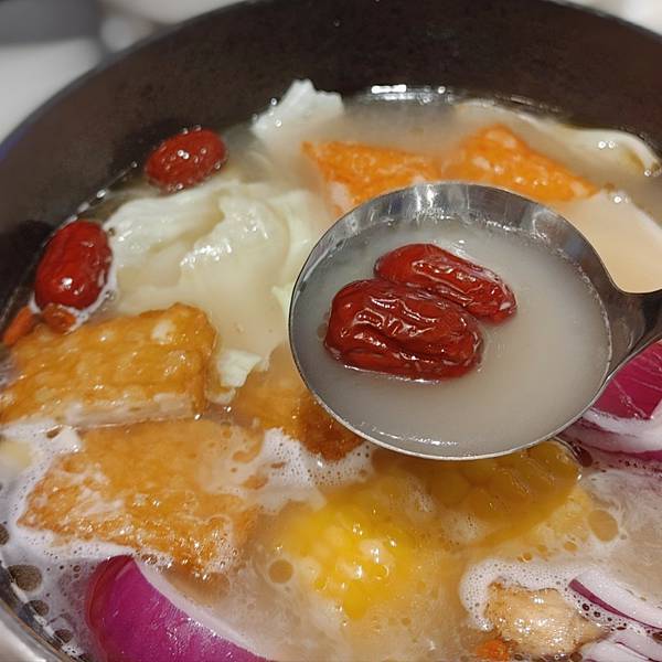 第一次點這個養生平常爸比很愛養生鍋,這款湯底爸比說好喝,裡面紅棗也很多,湯頭相對甘甜,Ruru喝了湯覺得這個是好湯底